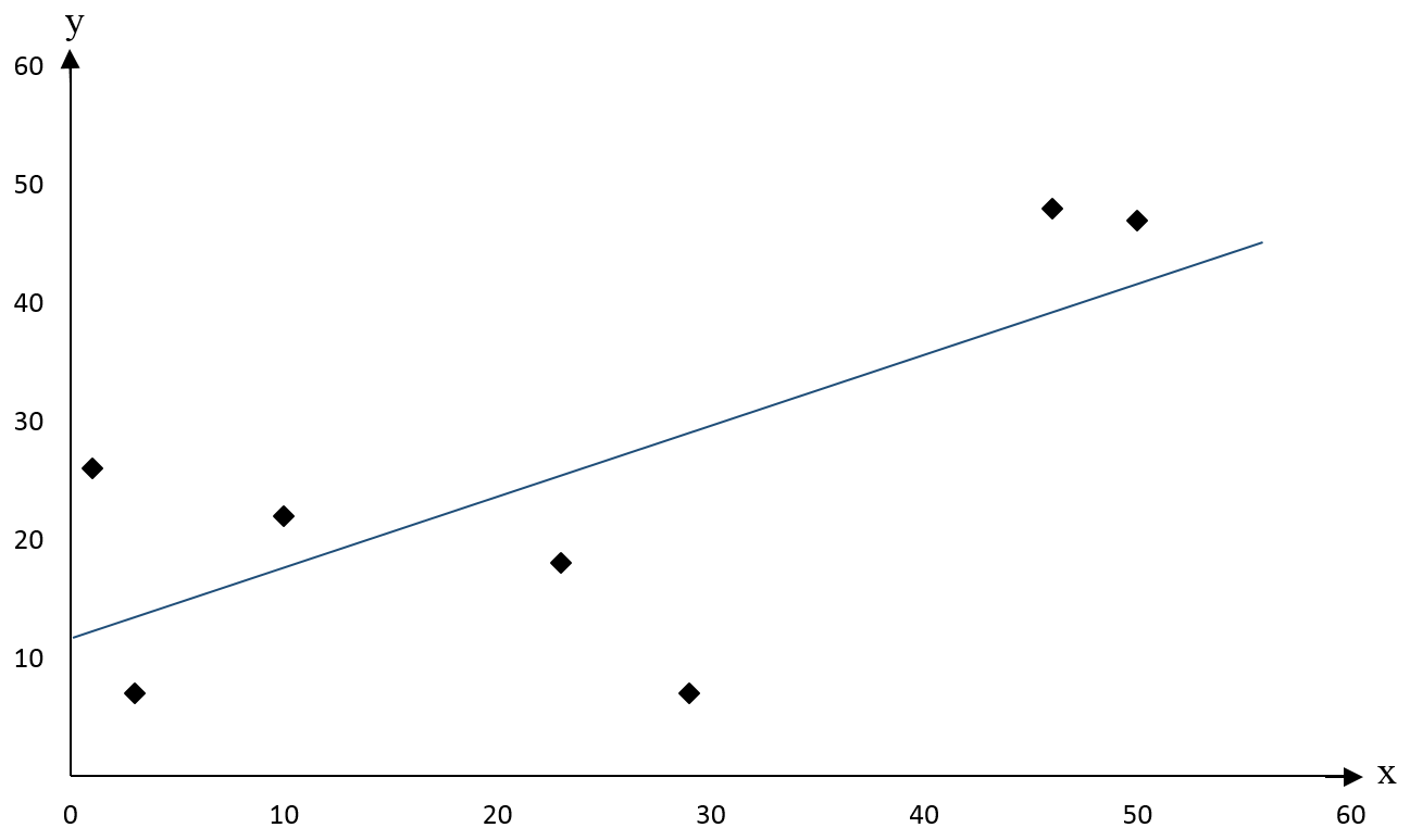 If \(x\) and \(y\) were perfectly correlated, then all points in the above scatterplot would lie exactly on the line. But this wouldn’t be the case in most situations as the points lie above or below the line, as shown in the following scatterplot: