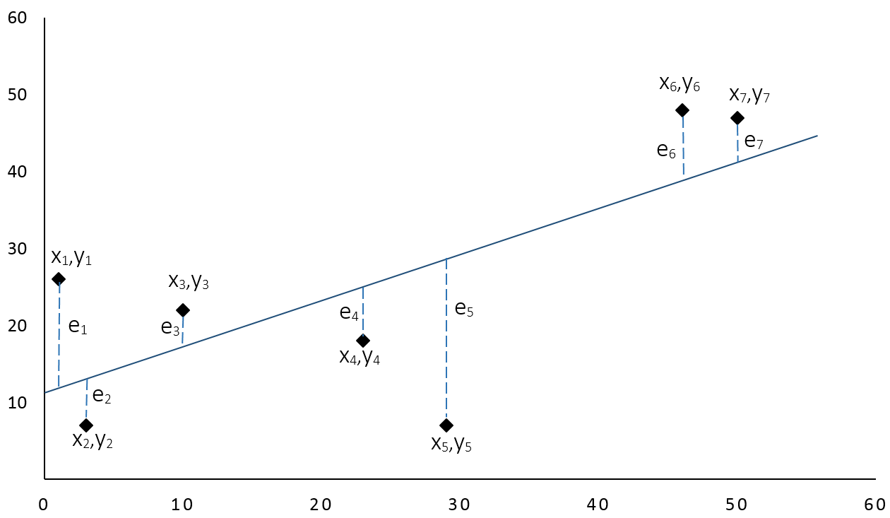 \(e_1,\ e_2\dots \dots e_3\) are called errors or residuals. These \(e_1,\)'s show the displacement of each point from the line. While fitting the straight line we need to do it in such a way that the errors are minimum. Errors above the line will have a positive value and those below the line will have a negative value. Since we are concerned only about the distance and not the signs, we consider the squares of errors to cancel the signs. Therefore, instead of minimizing the errors, we try to minimize the squares of errors.